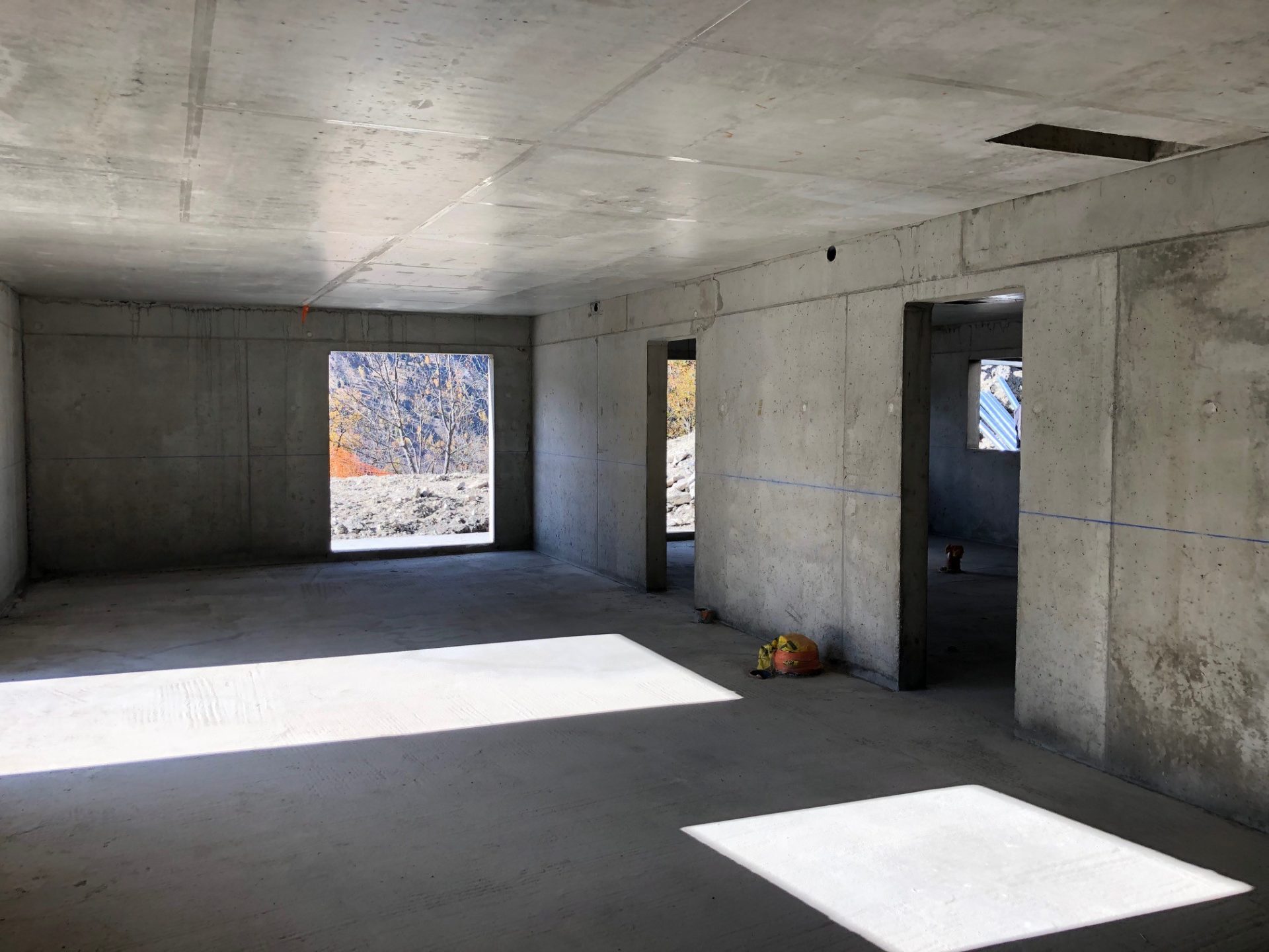 Déjà une grue démontée pour le Chalet A. Les travaux de gros œuvre sont terminés pour ce chalet et nous attendons les charpentiers pour commencer la mise hors d’eau du bâtiment.