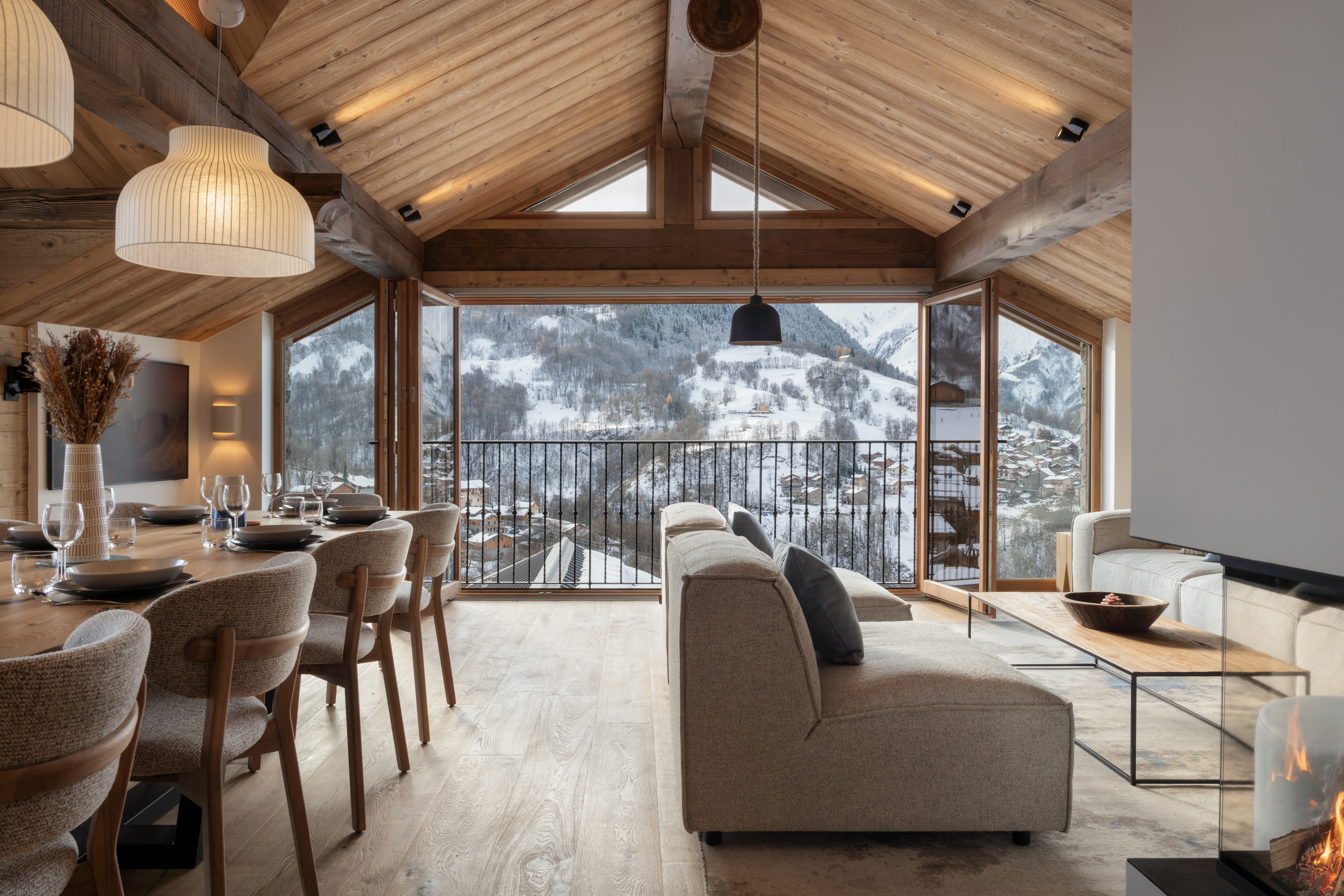Le volume du séjour se situe sous les combles. Il permet la création d’une pièce de vie lumineuse et spacieuse avec de la hauteur sous plafond, elle est dotée de grandes baies panoramiques toutes hauteurs ouvertes sur le paysage environnant. La façade principale de cette pièce est orientée au sud-ouest, ce qui en fait une exposition parfaite pour l’ensoleillement et la vue magnifique sur le panorama des sommets enneigés.
